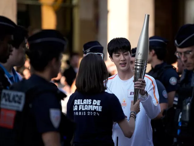진은 파리의 리볼리 거리 교차로에서 카루젤(Carrousel) 광장까지 성화 봉송을 이어갔습니다. 그는 루브르 박물관의 피라미드 앞에서 프랑스의 프리스타일 스키 전 국가대표 산드라 로라(Sandra Laoura)에게 횃불을 전달했습니다. 약 10분 동안 진행된 성화 봉송을 마친 진은 현장에 모인 관중들에게 손 인사를 건네며 그의 역할을 마무리했습니다.